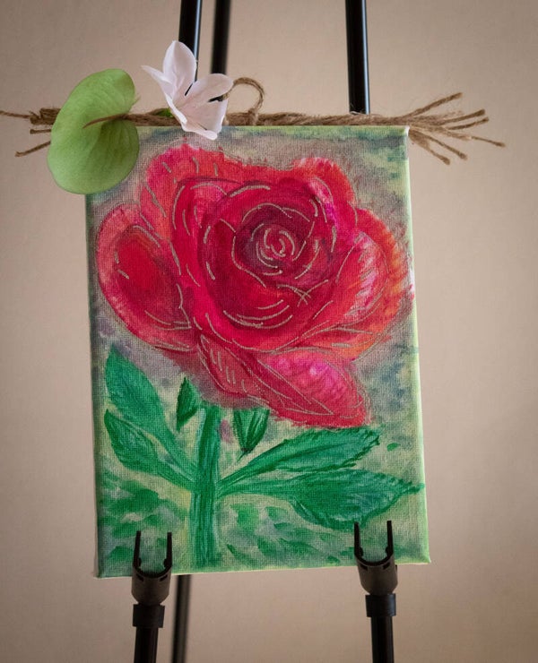 tela rotonda con sfondo dipinto ad aquerello con fiori in tessuto in rilievo e cornice con corda di juta